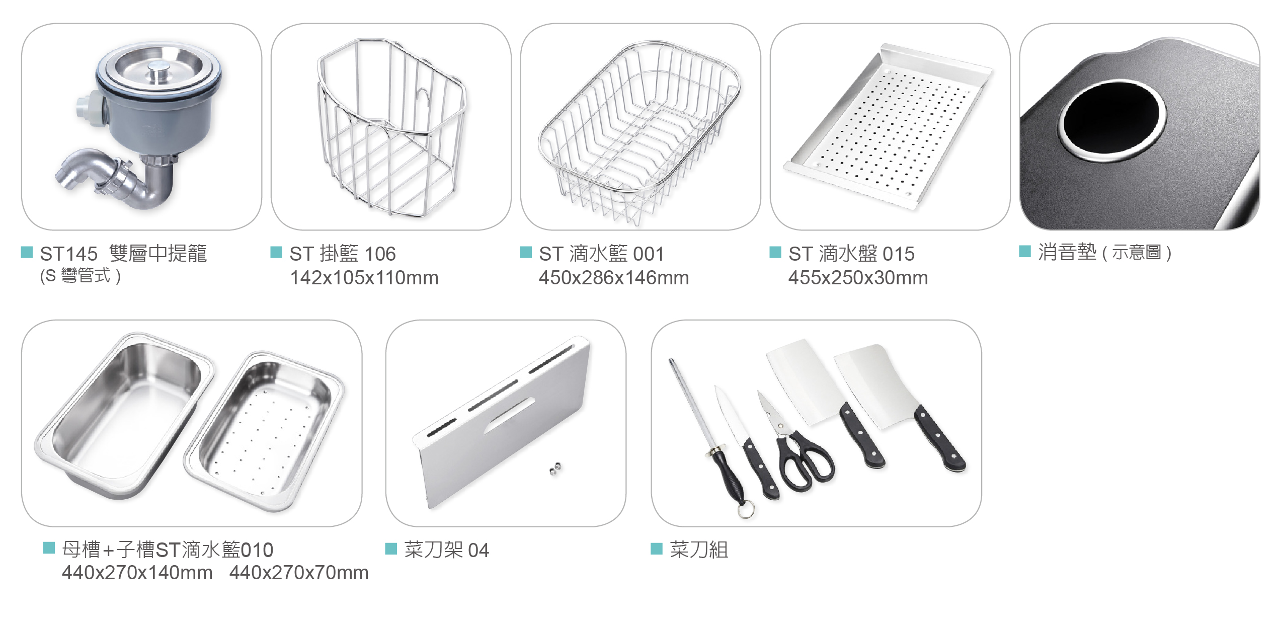 標準配件: ST145 雙層中提籠(S 彎管式)、消音墊