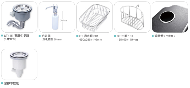 標準配件: ST145 雙層中提籠(S 彎管式)、消音墊、溢水孔、溢水管