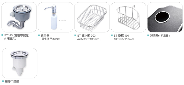 標準配件: ST145 雙層中提籠(S 彎管式)、消音墊、溢水孔、溢水管